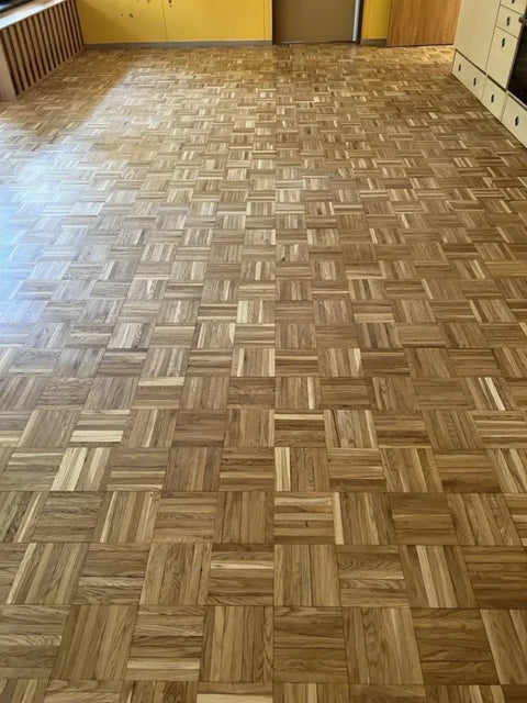 Finally, the floor was treated with a high-quality oil from our store to not only emphasize its natural beauty, but also to ensure appropriate sealing protection. This final treatment was crucial for the longevity of the renovated parquet floor.